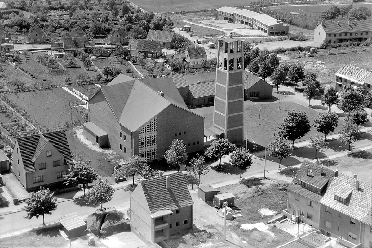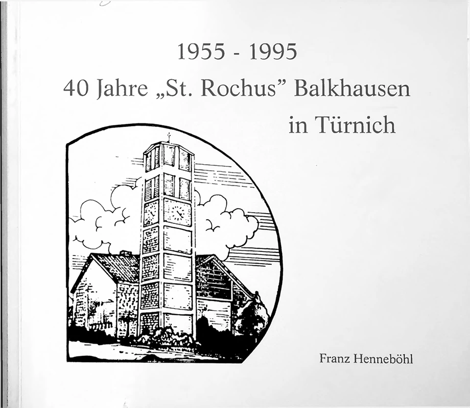 Alt St.-Rochus musste wegen des anrückenden Braunkohle-Tagebaus "Frechen" ebenso wie der Ort Balkhausen umgesiedelt werden. Der Neubau der Kirche war wegen seiner "Moderne" sehr umstritten. Das Kirchengebäude sah aus wie ein Zelt, der Turm steht abseits daneben und der Innenraum entspricht nicht dem gewohnten barocken Stil. Am 10.10.1954 wurde der Grundstein gelegt und bereits am 9.11.1955 nahm Kardinal Frings die feierlichen Zeremonienen der Weihe vor. Der Ambo und Altarbereich sowie der Taufbereich wurden 1992 noch einmal umgestaltet.