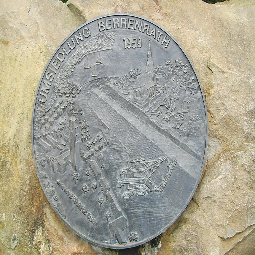 Bis in die 1950er Jahre stand hier der ehemalige Ort Berrenrath. Ein Gedenkstein am Seeufer erinnert daran.